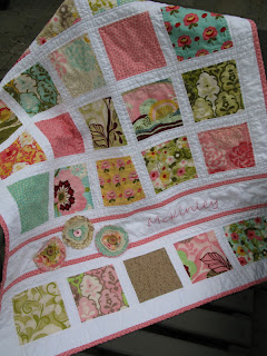 I made the quilt using a Moda Hunky Dory charm pack, then framed each square in white to make it pop. The back is a solid of my favorite pattern from this series- the flowers are so vibrant and retro looking. I then bound it in the pink polka dot from the series. I also put in a white bar on which I hand embroidered Mckinley's name. To do so I printed a font and size on my computer, held it up to a window, and traced it onto the white sash. I then used 3 embroidery threads to stitch it up. Thanks to Amy at NanaCo for the advice! I extended the name stash to the edges, beyond the borders of the blocks, to add interest. I really like how it breaks up the quilt.